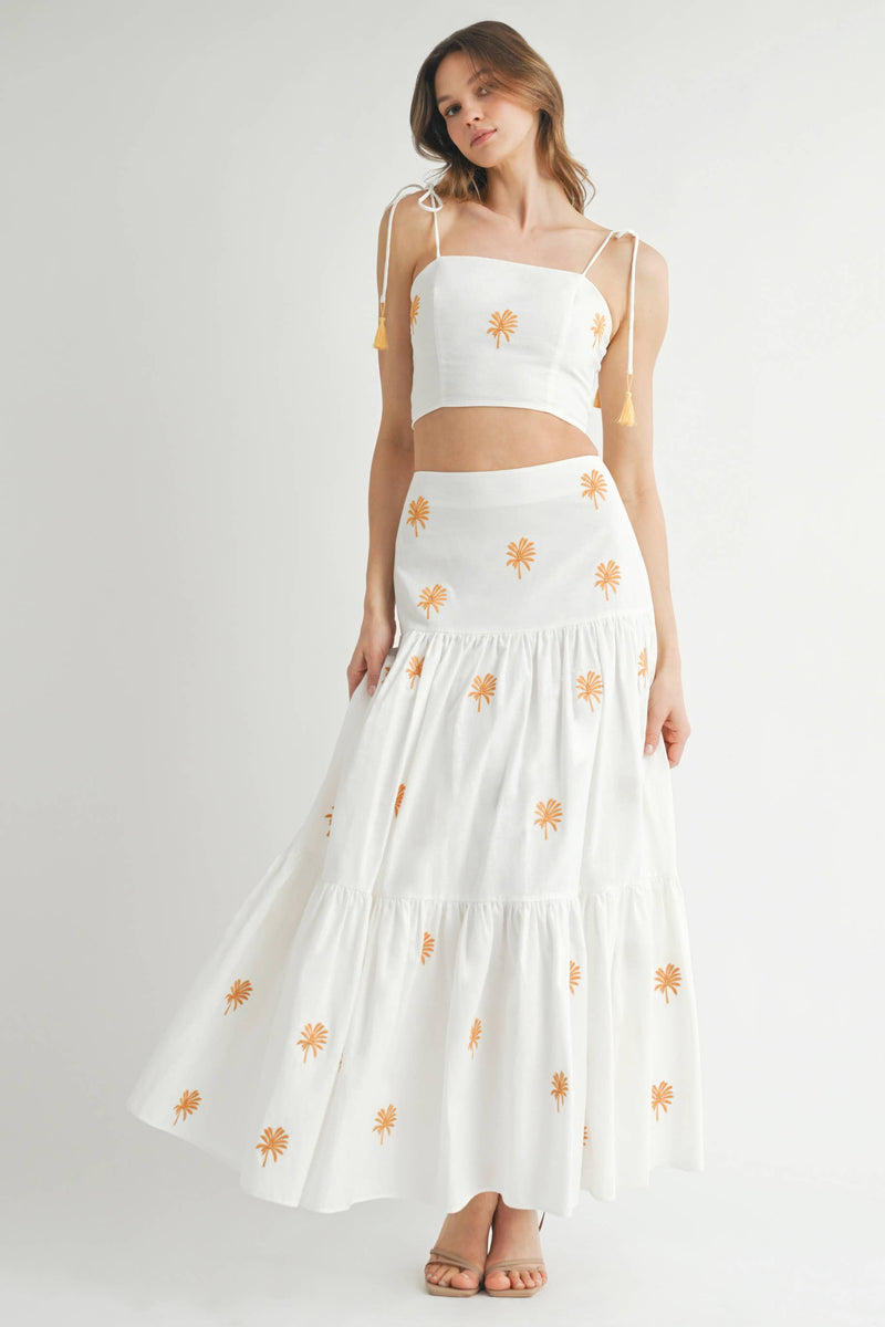 Endless Blu Palm Embroidered Tiered Maxi Skirt