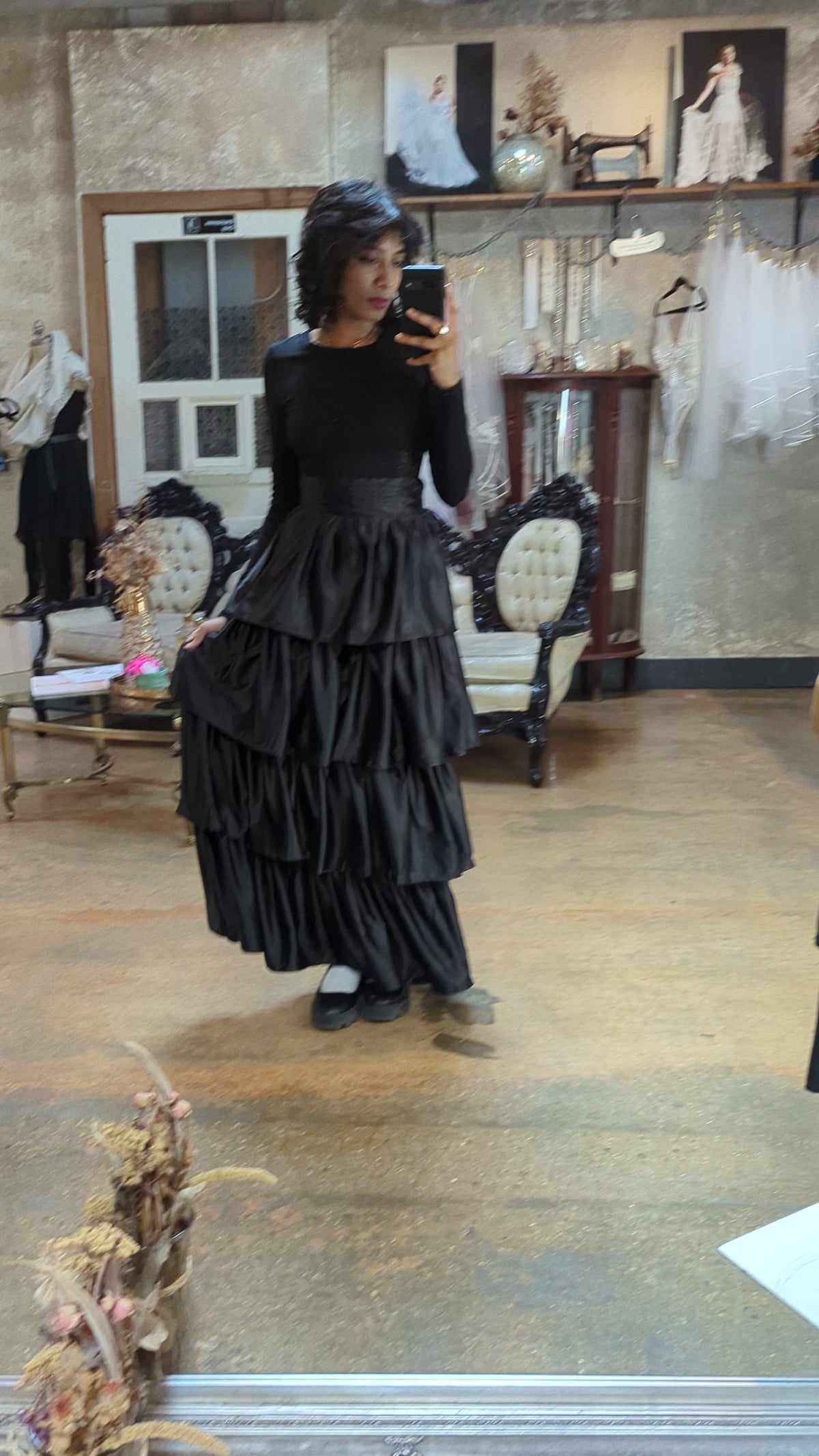 High-waisted tiered black satin maxi skirt, with lots of volume and ruffles! Meticulously crafted for a flattering silhouette and graceful movement. Perfect for formal events, weddings, evening soirees and more!