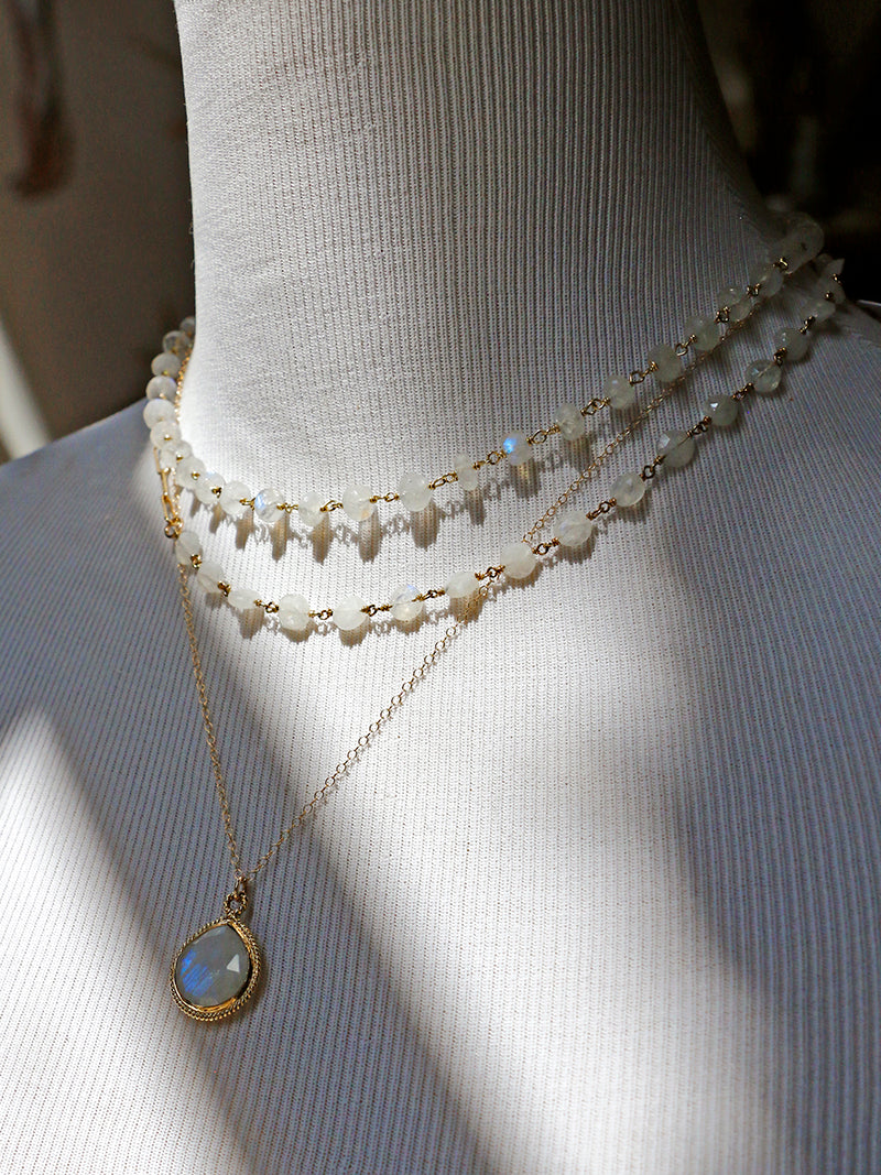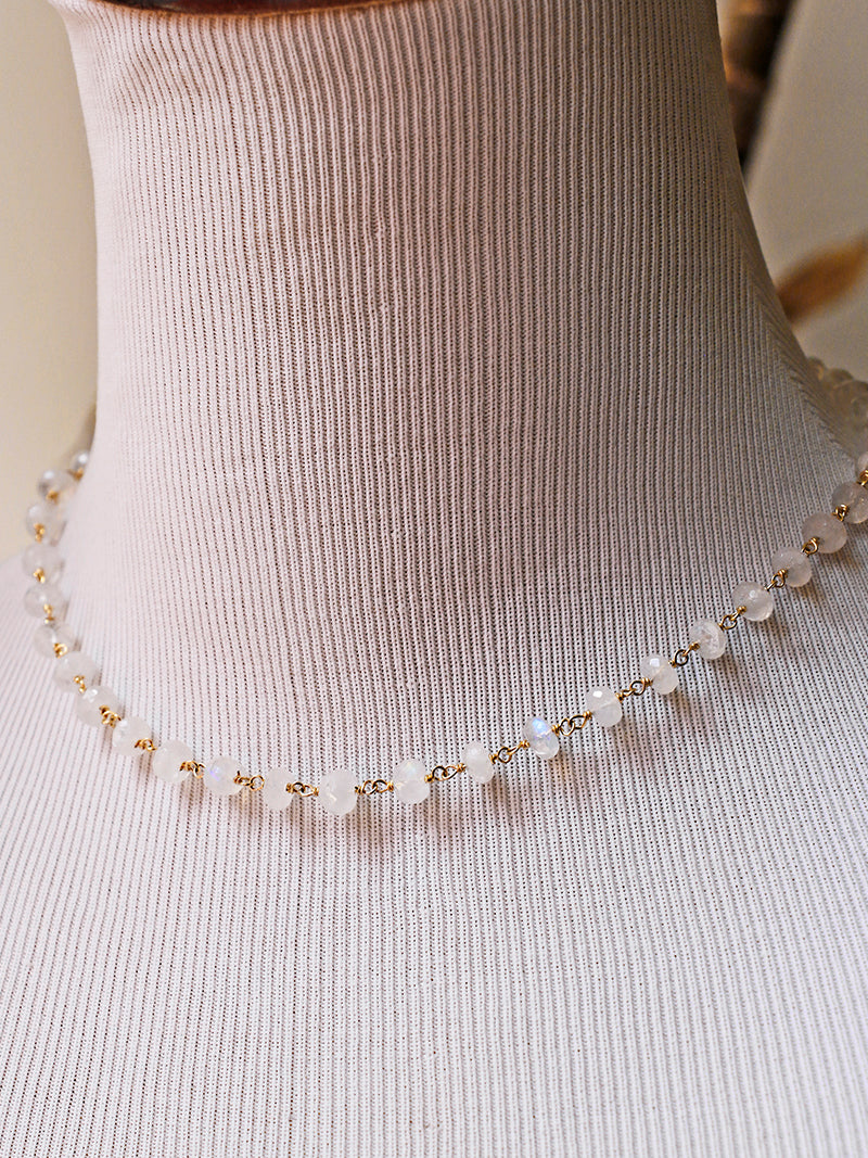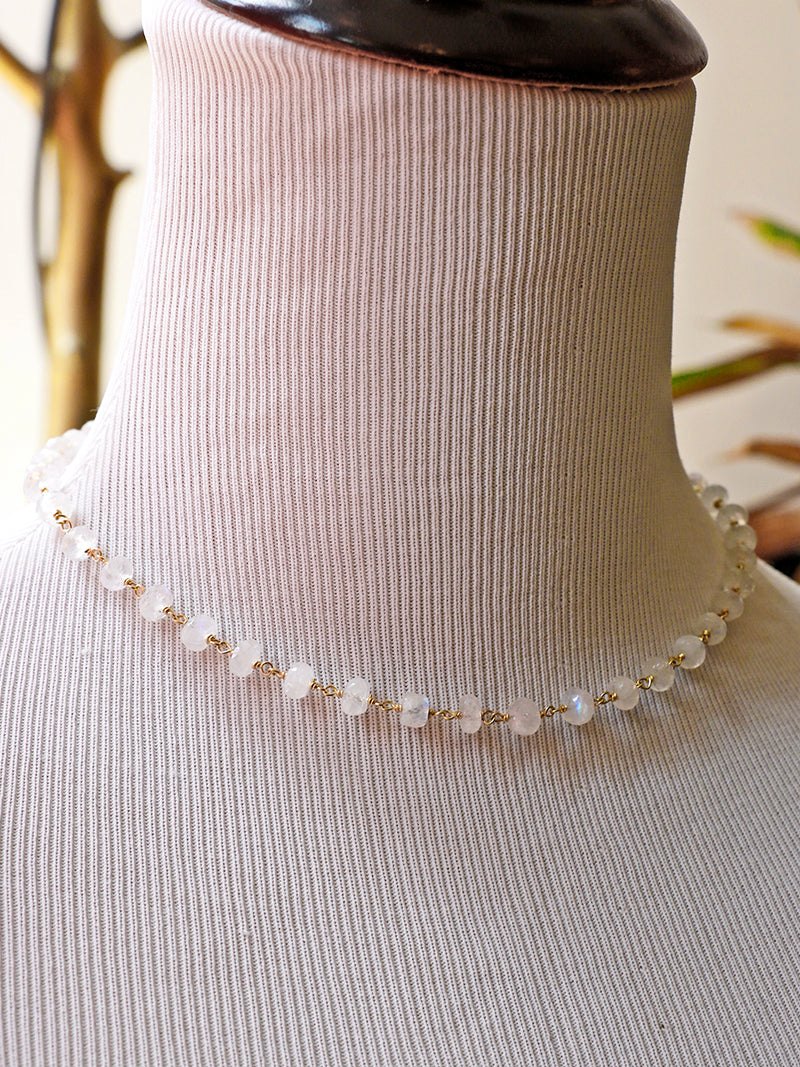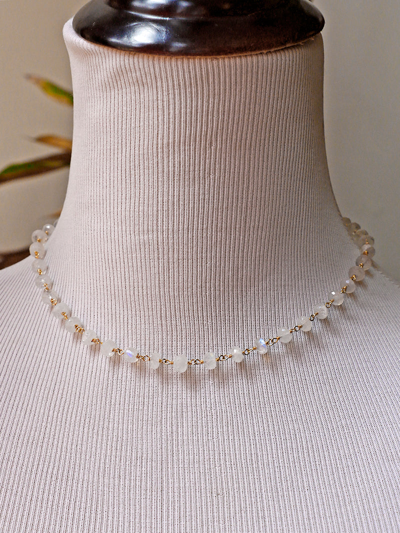 14k gold filled wire wrapped moonstone beaded chain necklace. The faceted moonstone beads sparkle and glint, and display the gorgeous blue-orange iridescence typical of the stone in the light. Individually wire wrapped for a delicate, boho look.