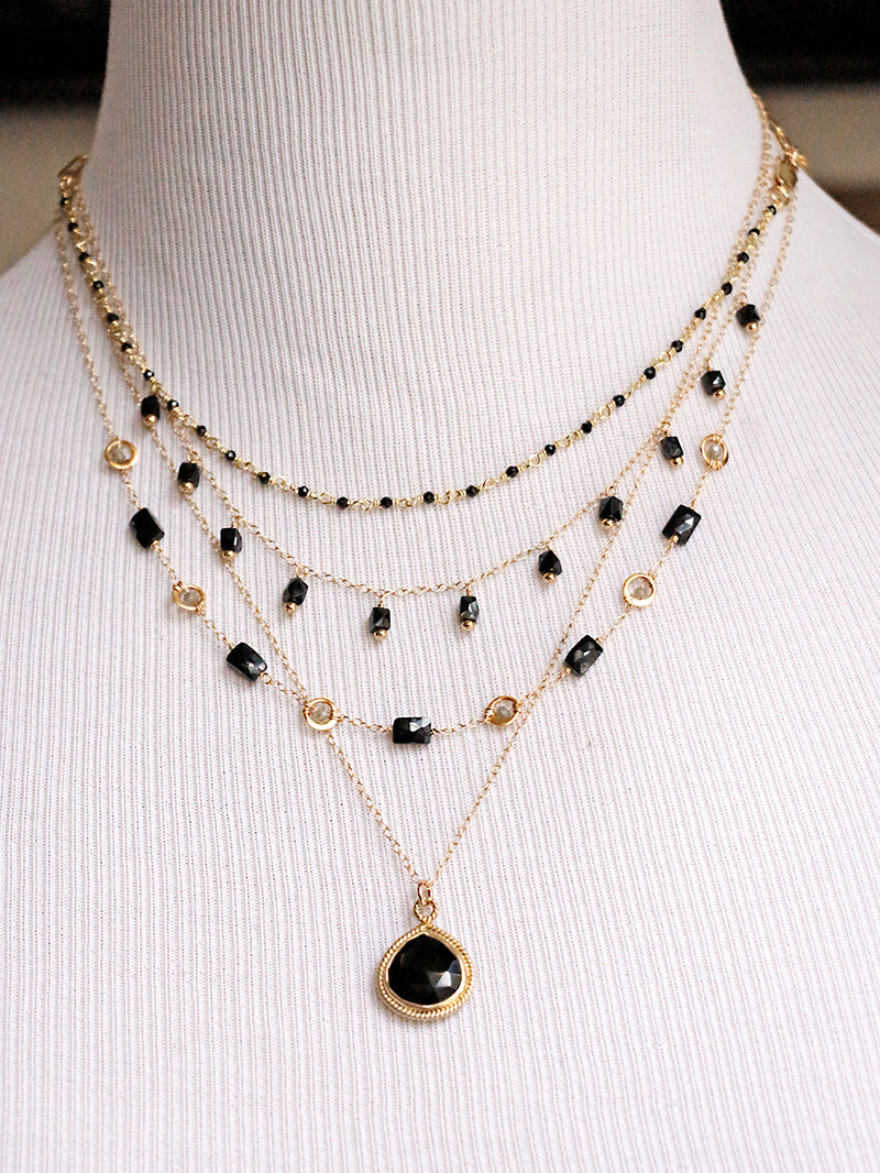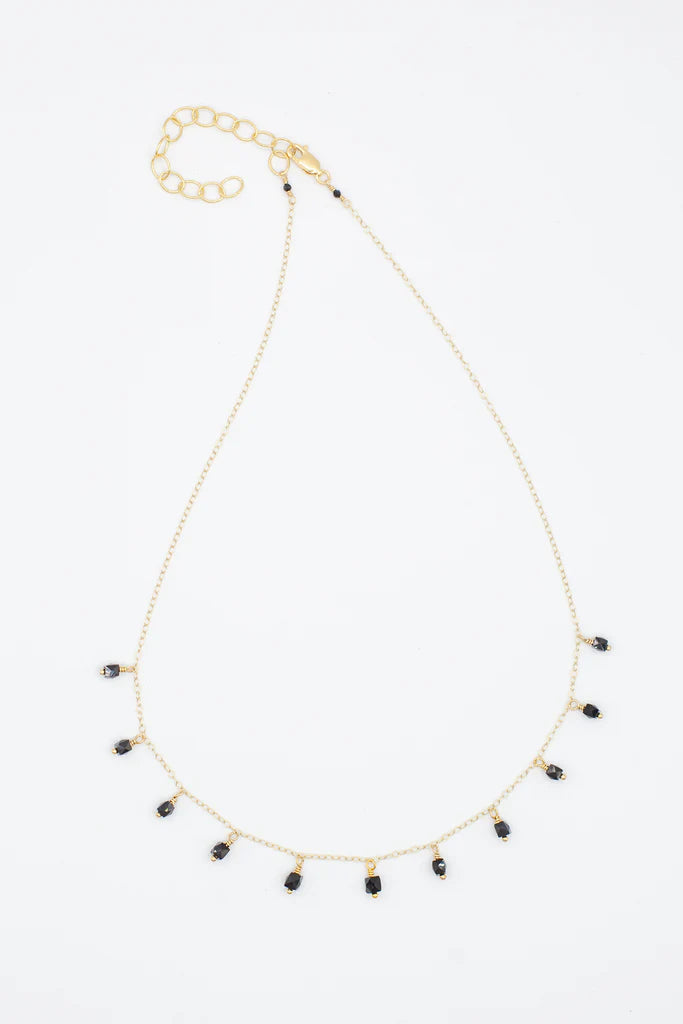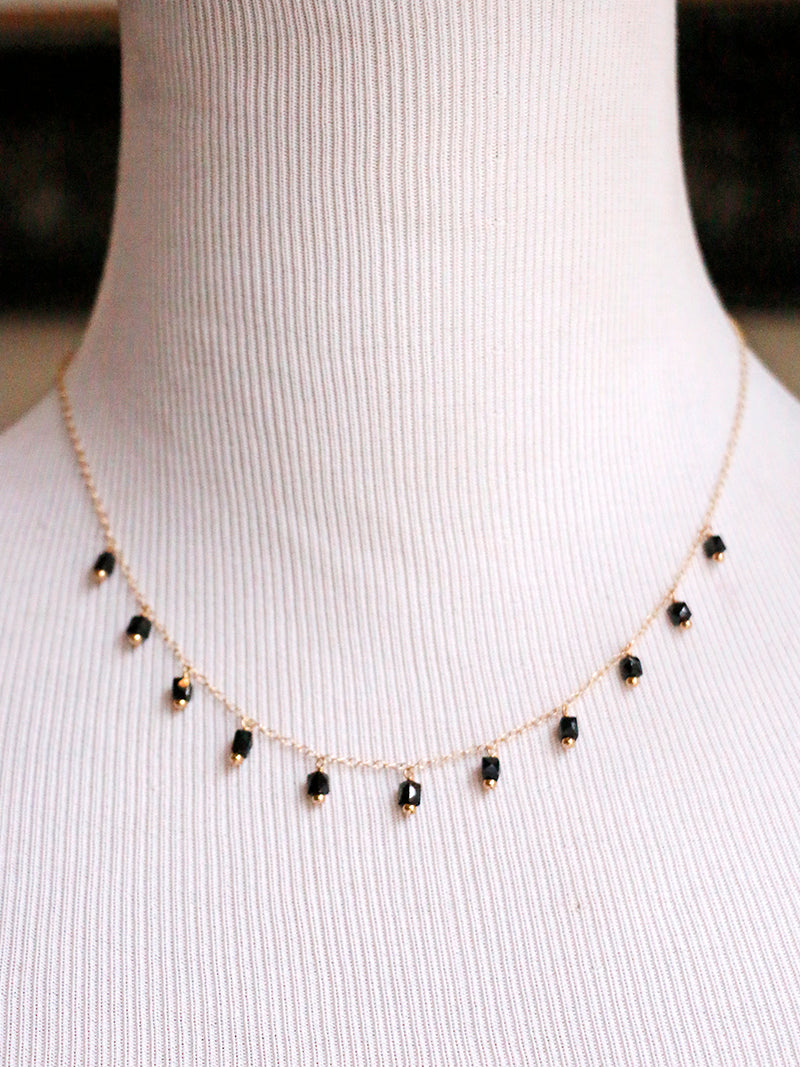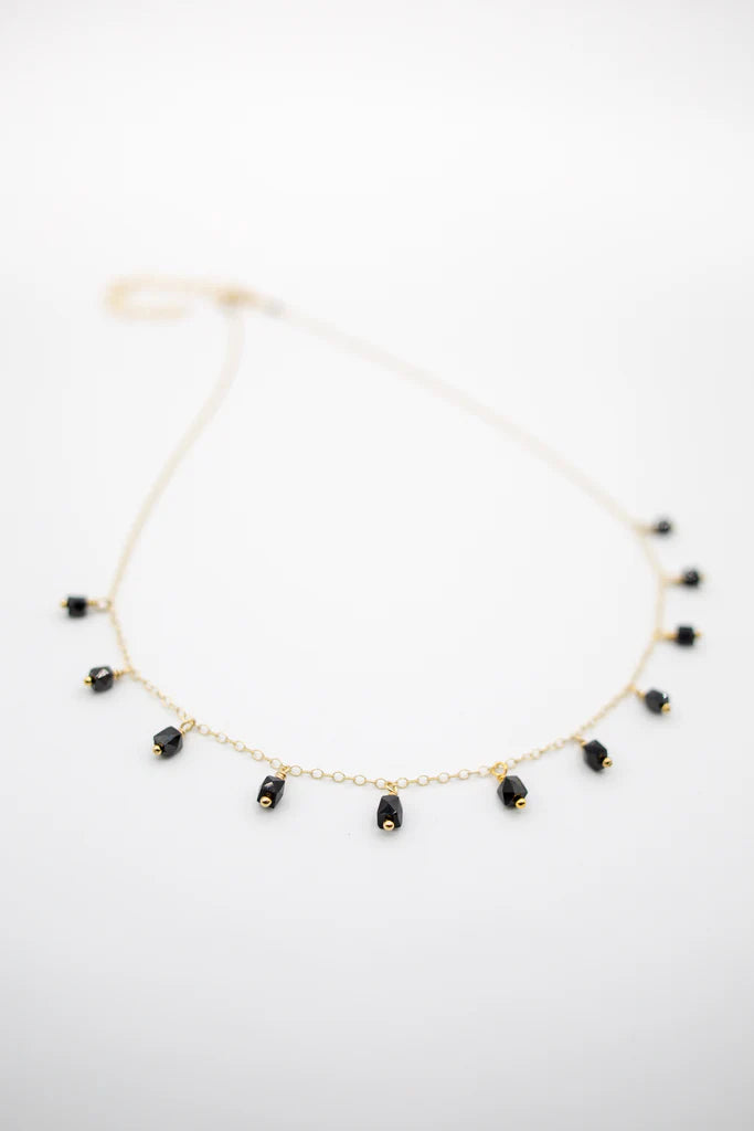 14k gold filled handmade necklace with faceted black spinel drop charms. This necklace is delicate & beautiful! Perfect for layering, and a statement piece on its own. Made by hand with love by local Philadelphia designer Susan Rifkin.