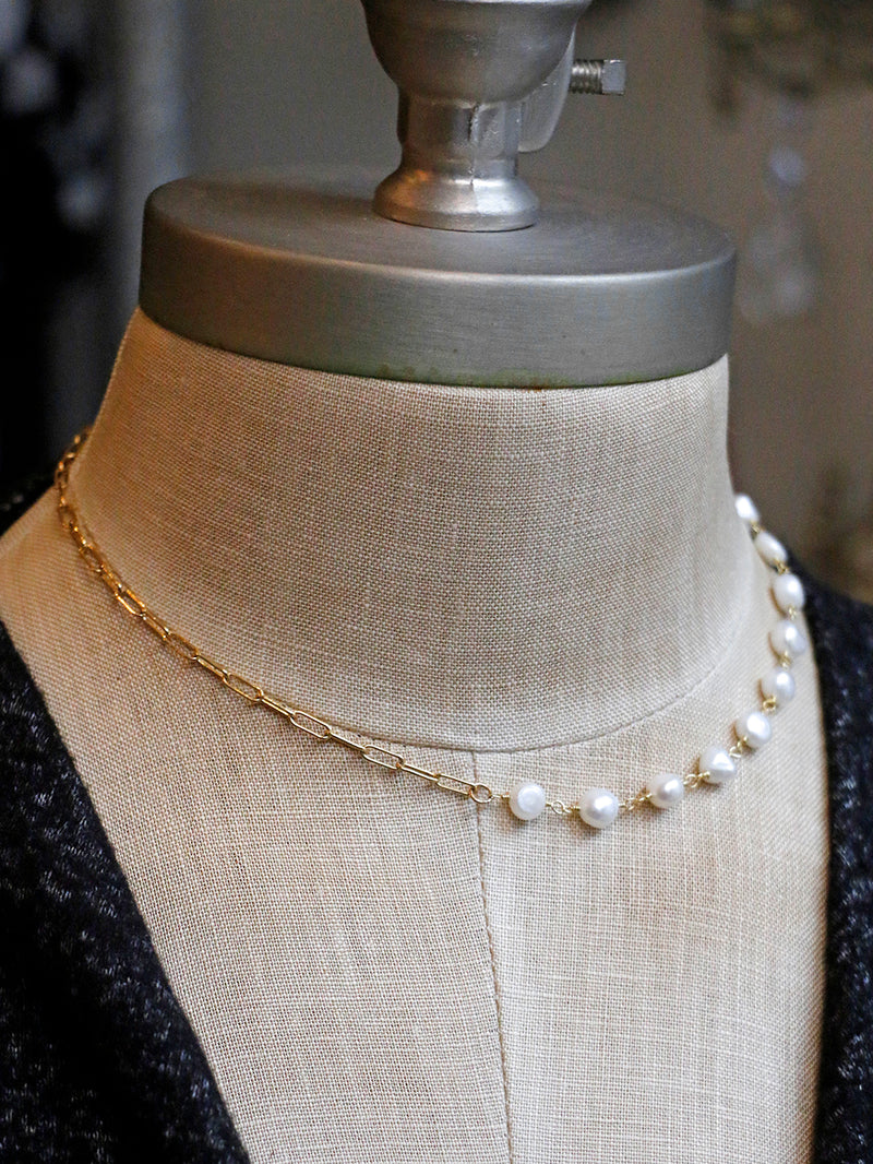Susan Rifkin Pearl + Gold Paperclip Chain Necklace