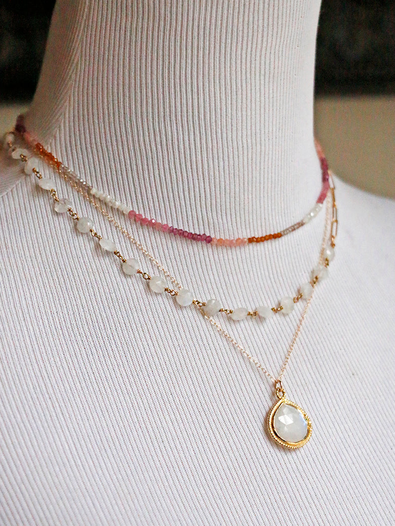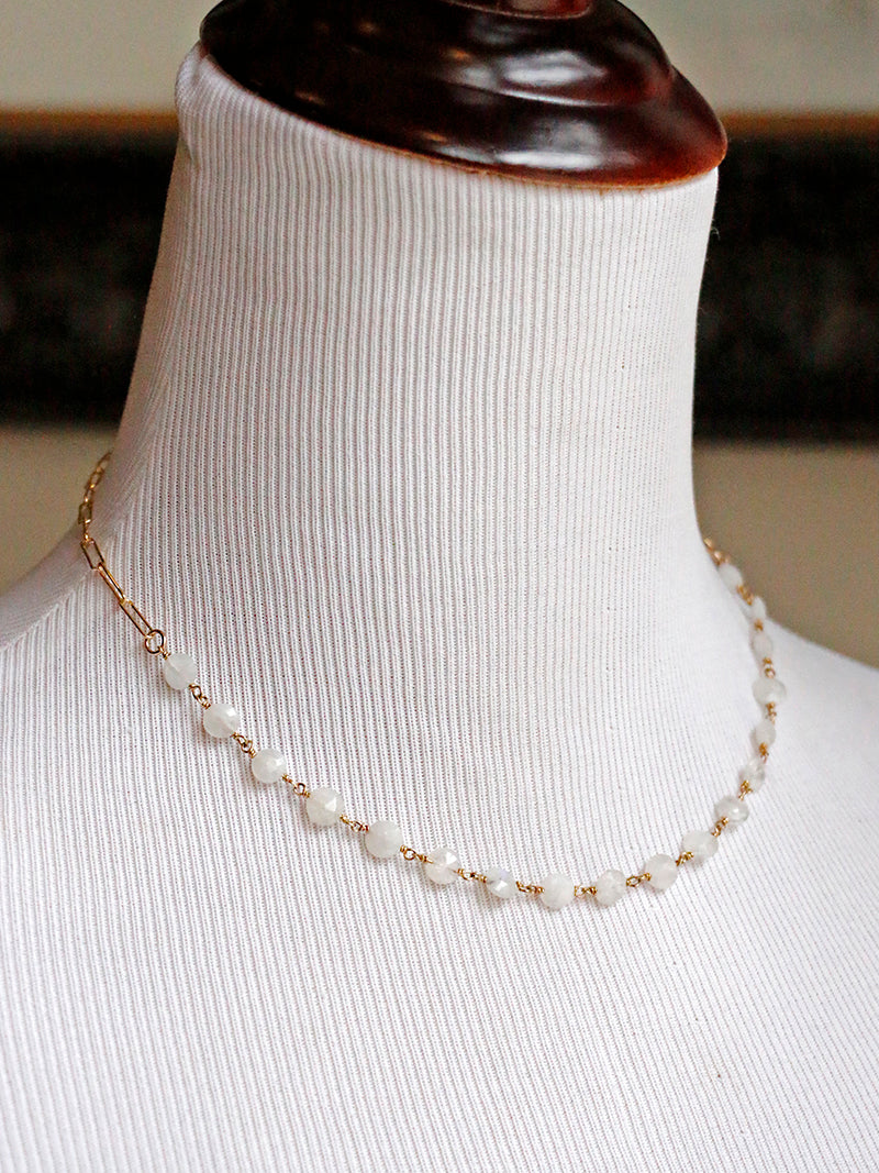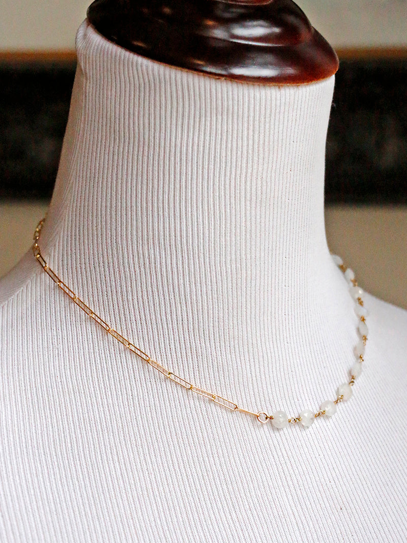 14k gold filled half paperclip chain + half wire wrapped beaded moonstone chain necklace. A dainty & minimalist everyday wear piece. The moonstone beads display a gorgeous blue-orange iridescence in the light, with a milky white tone to it. Individually wire wrapped for a delicate, boho look.