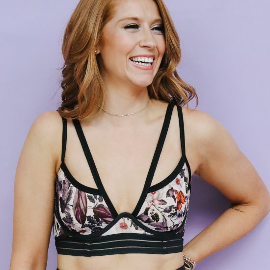 The Galina is monowire bra that has vertical seams on the bra cups, fold over elastic along the edges, boning at side seams, exposed channeling, wide elastic band at the bottom, hook + eye closure at center back, and adjustable shoulder straps.