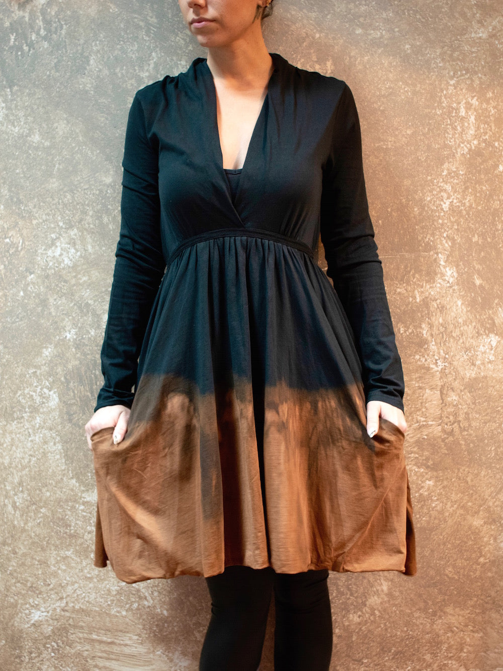 Deep V with gathered front waist and tie back. Adjustable sizing.